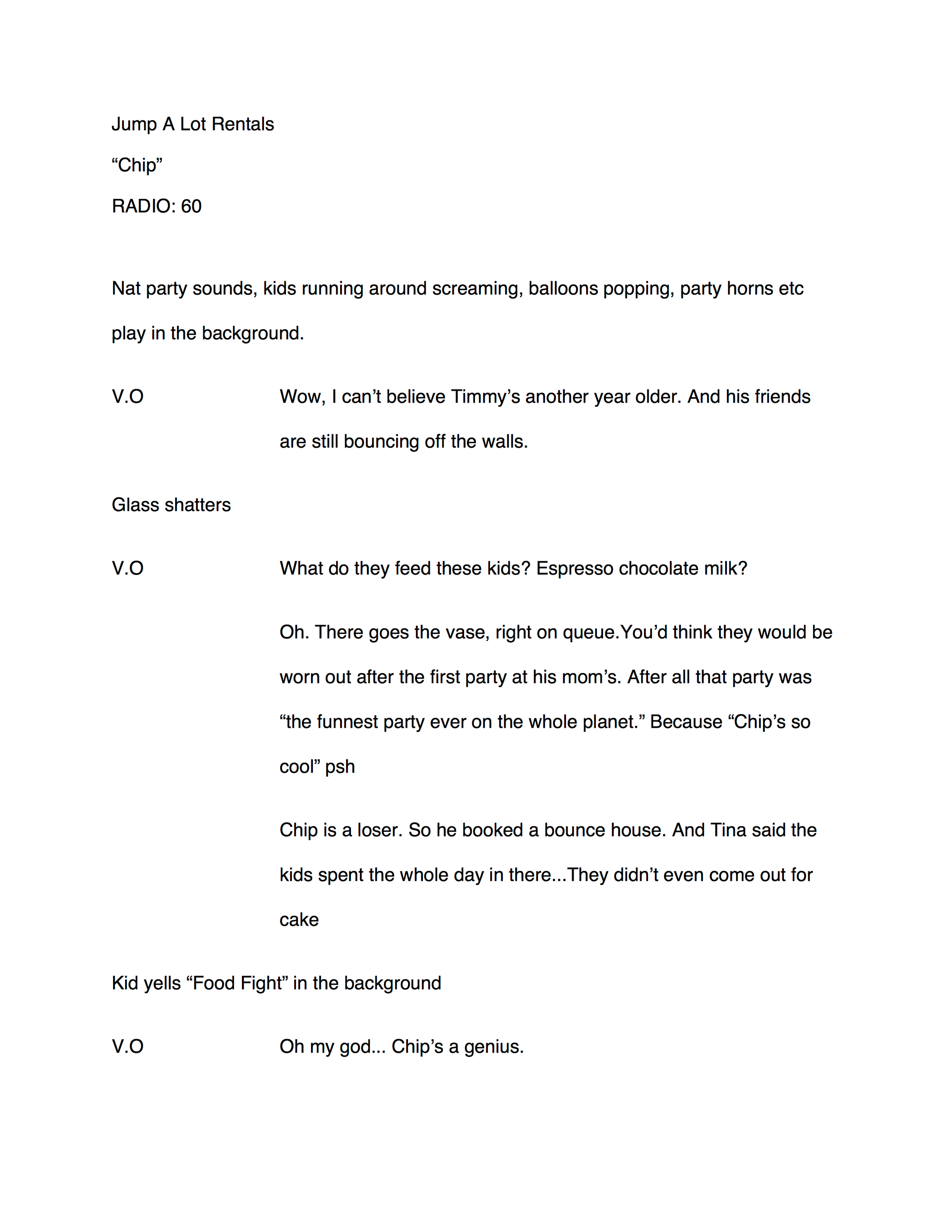 Radio commercial for inflatable bounce house rental company located in New Jersey. A jealous dad realizes his ex-wife's new boyfriend "Chip" isn't so lame after all.